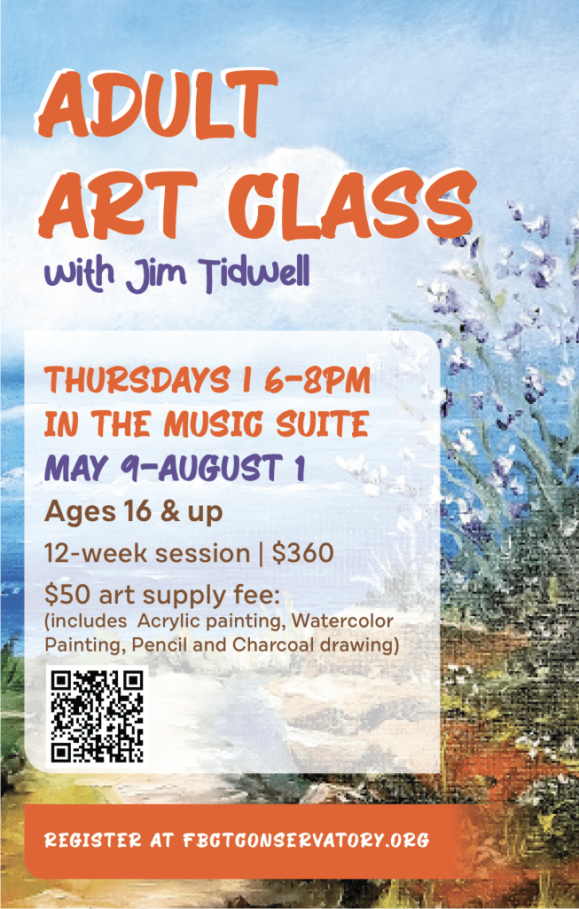 This is a 12 week session of 2 hour Art classes from May 9 – August 1. The cost for the class is $360 plus a $50 art fee. These classes are taught by local artist Jim Tidwell. The classes are for ages 16 and up and take place Thursdays, 6:00 – 8:00pm in the Music Suite. We will do acrylic painting, watercolor painting, and pencil and charcoal drawing. The art fee covers initial start up kit of one set of acrylic bushes, one set of acrylic paint and set of watercolor paint, canvases, watercolor pad, watercolor pencils, one drawing kit and thick sketch book, and pencil/charcoal set, and more!